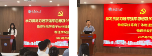 学院等离子体物理教工党支部与学院团委联学联建,组织师生在物理楼322会议室集中观看,王正汹院长等学院领导,部分院办老师一同观看庆祝活动及阅兵式。会议由团委赵思语主持,等离子体物理教工党支部书记王奇介绍了中国人民抗日战争的历史背景,抗战胜利80周年纪念日的重大意义,并传达了上级党委的指示及精神,带领师生深入学习贯彻习近平强军思想,为观看阅兵筑牢思想基础。