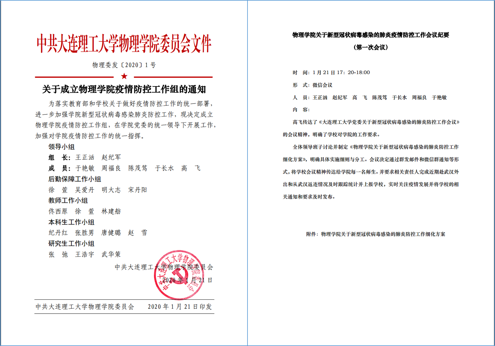 学校疫情防控工作伊始,新利·体育(中国)官方网站迅速成立了以党委书记王正汹、院长赵纪军为双组长的学院疫情防控工作组,明确该项工作由学院党委负责,领导班子全体成员参与并承担不同分工。学院党委参考 “一岗双责”要求,确定了领导班子各成员在疫情防控工作中的责任所在,相应按照党、政、研、本的划分成立了4个工作小组,将疫情防控工作的上级部署与院内事务进行了清晰的分配。