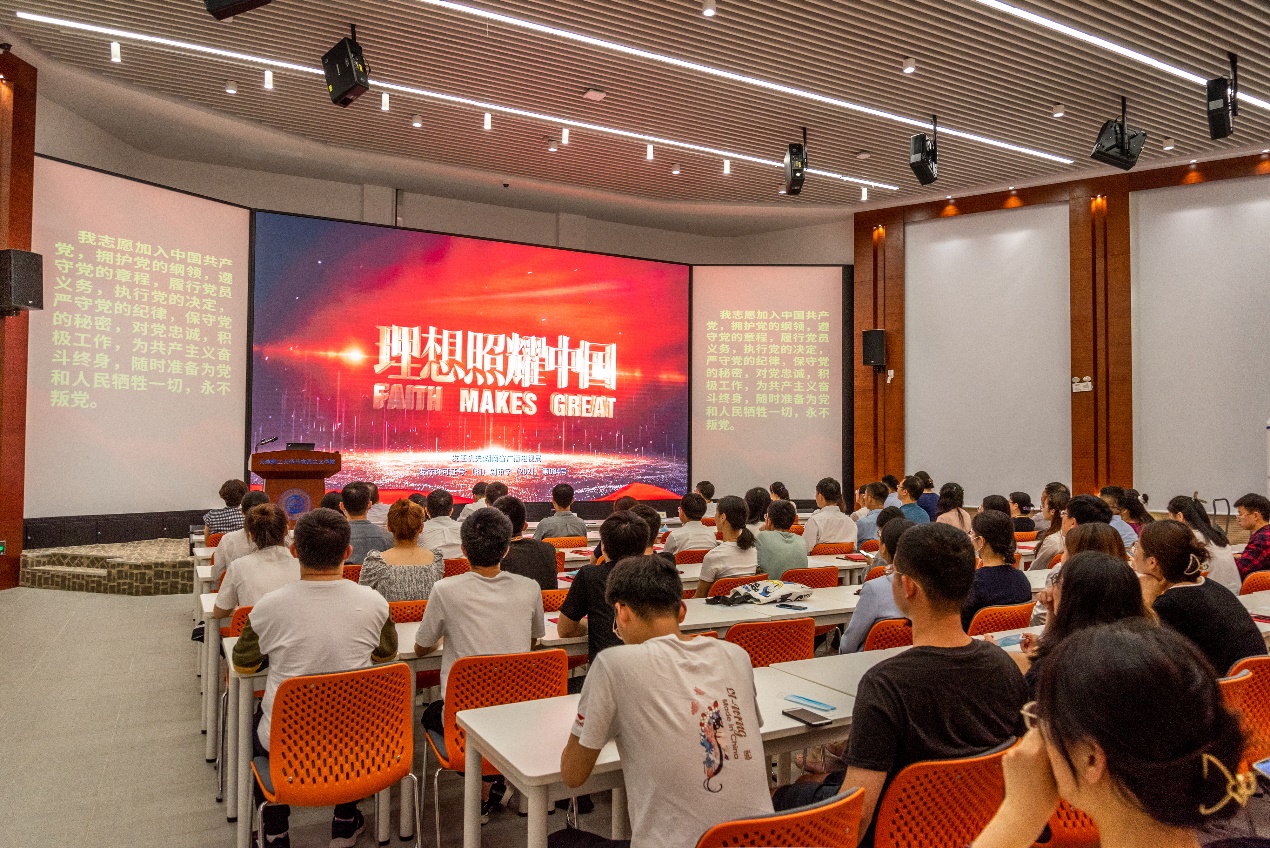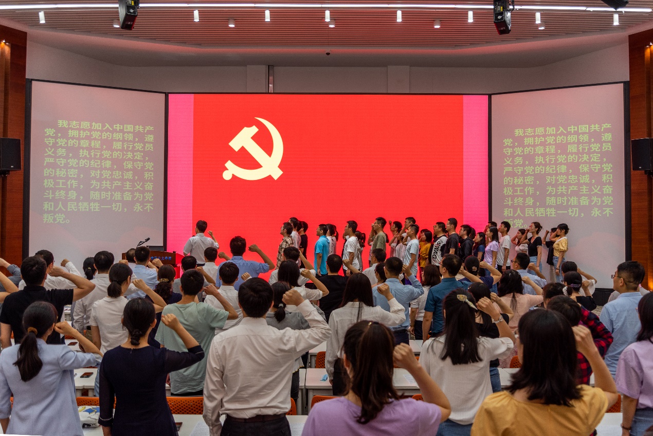 表彰大会在庄严的国歌中启幕。学院党委书记王正汹带领全体新发展党员在党旗下进行宣誓,到会的其他党员重温入党誓词。