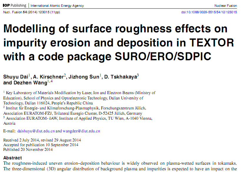 近日,新利·体育(中国)官方网站青年教师戴舒宇关于核聚变装置中粗糙表面上杂质输运和沉积的三维模拟研究成果最终发表在国际核聚变领域最具权威期刊《核聚变》(Nuclear Fusion)。这篇文章经过4位审稿人的严格评阅,最后得到了他们对工作的一致肯定,其中一位审稿人还给出了"excellent paper"的评价。这项研究成果的开展是建立在之前的二维模型基础上开展的(Dai S Y et al 2013 PPCF 55 055004),该二维模型的文章被欧洲同行多次引用;最新的三维模型的模拟结果与TEXTOR和Tore Supra等聚变装置上的实验结果有很好地吻合,这也为后续的工作的开展打下了良好的基础。此外,该项工作也得到了王德真教授和孙继忠教授的支持和帮助。《核聚变》期刊是由国际原子能机构主办的可控核聚变领域的顶级杂志。我国每年在该期刊发表的文章在10篇左右,并且主要以实验文章为主。本研究工作得到了ITER专项基金、国家自然科学基金、中国博士后科学基金、辽宁省高等院校科学研究项目的联合资助。