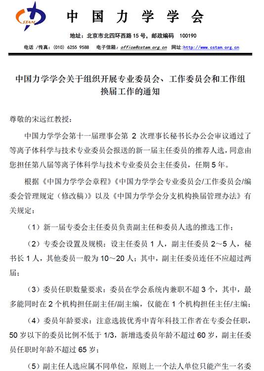 近期,我校新利·体育(中国)官方网站宋远红教授当选为中国力学学会第十一届理事会理事,并通过中国力学学会第十一届理事会第二次理事长秘书长办公会审议,正式成为第八届等离子体科学与技术专业委员会主任委员,任期5年。