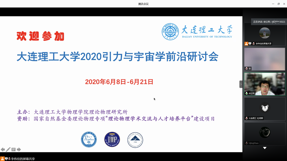 2020年6月8日-6月21日,由新利·体育(中国)官方网站理论物理研究所主办的“大连理工大学2020引力与宇宙学前沿研讨会”成功召开。本次会议受国家自然基金委理论物理专项“理论物理学术交流与人才培养平台建设项目”资助,组织者为大连理工大学徐立昕教授和李伟佳副教授。会议采用了“腾讯会议”进行线上学术交流,共有中科院及海内外50余所兄弟院校和科研院所的100余名引力与相对论领域的专家报名参会(峰值在线人数为160余人)。