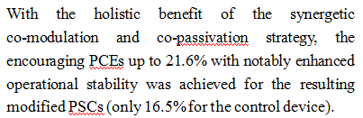 已证实提高结晶度、钝化晶界和界面缺陷对于提高钙钛矿太阳能电池(PSC)的功率转换效率(PCE)和稳定性至关重要。鉴于此,本成果提出了一种共调结晶和共钝化的协同策略,以同时提高结晶度并钝化基于FAPbI3的钙钛矿太阳能电池的晶界和表面缺陷。凭借增强的结晶度、减少的缺陷和陷阱位点以及减轻非辐射复合和抑制离子迁移的整体优势,所得改性钙钛矿太阳能电池实现了高达21.6%的效率。此外,该策略使器件在连续光照下具有显著增强的运行稳定性,在连续光照800小时后,仍保持初始PCE的84%以上。论文第一作者为新利·体育(中国)官方网站博士后王敏焕,大连理工大学边继明教授、化工学院史彦涛教授为共同通讯作者。该成果是王敏焕博士后上一篇(Advanced Functional Materials,31, 2007520 (2021)基础上取得的最新成果。该成果得到国家自然科学基金等项目资助。