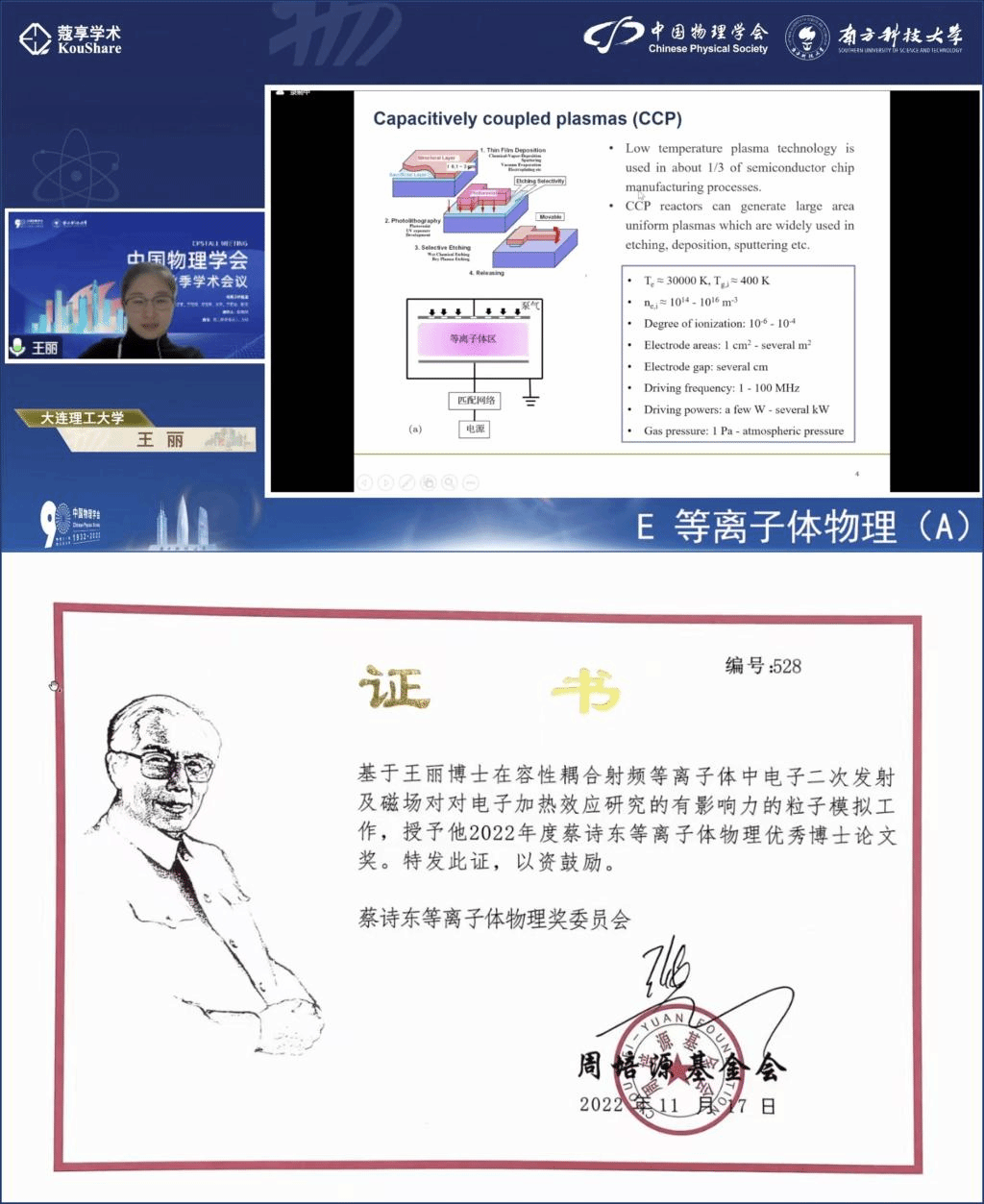 在2022年中国物理学会(CPS)秋季学术会议上,蔡诗东等离子体物理奖委员会公布了第23届蔡诗东等离子体优秀博士论文奖获奖人名单,大连理工大学王丽博士因其在容性耦合射频等离子体中电子二次发射及磁场对电子加热效应粒子模拟方面做出了具有影响力的工作而获此殊荣。国际知名聚变等离子体物理学家万宝年院士为其在线颁奖,王丽受邀作了题为“容性耦合射频等离子体中电子动力学过程的先进PIC/MCC模拟”的报告。