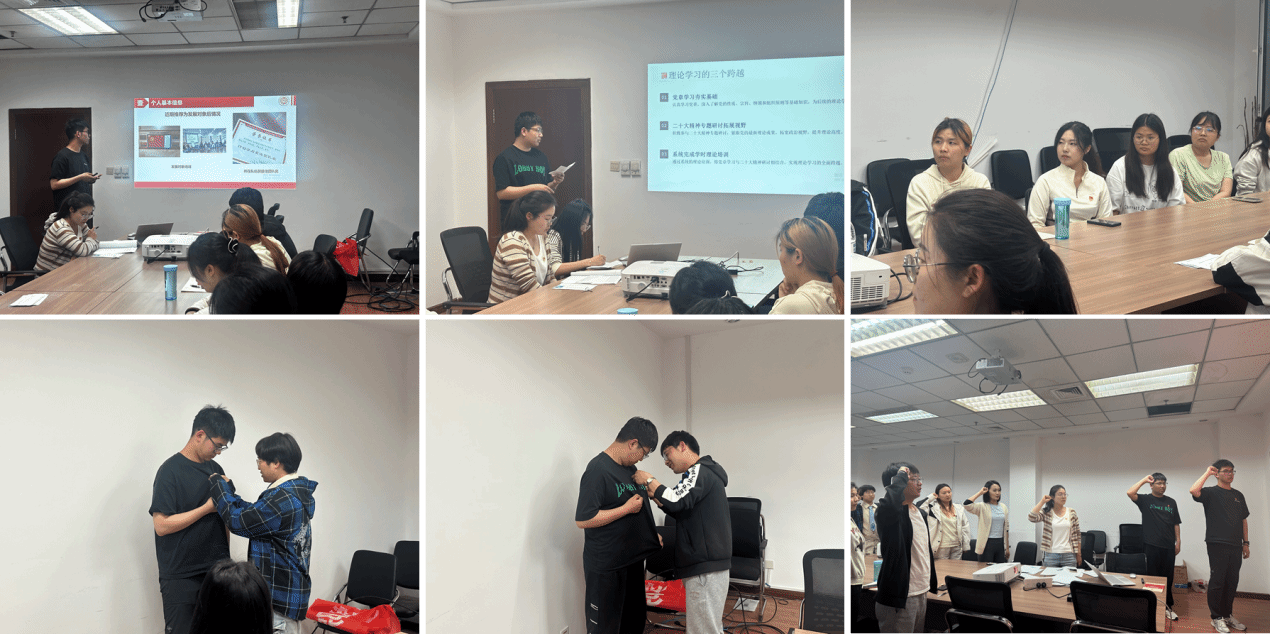 在党课学习后,党支部严格按照组织程序开展了关于接收沈文强、黄昊两位同志为中共预备党员的讨论与表决。两位发展对象依次汇报个人对党的认识、入党动机、现实表现及需向组织说明的问题。入党介绍人分别介绍了他们的表现情况,并对其是否入党给出意见;党支部委员会报告了政治审查情况及公示结果。与会党员充分发表意见,经全体党员无记名投票表决,一致同意接收沈文强、黄昊两位同志为中共预备党员。在庄重的氛围中,入党介绍人分别为沈文强、黄昊同志佩戴上党员徽章。最后,两位同志庄严宣读入党誓词,党支部全体党员共同重温入党誓词。