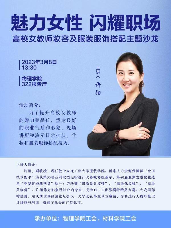为庆祝“三八”国际妇女节,增加女教职工会员职业幸福感,新利·体育(中国)官方网站工会联合材料学院工会组织了一次主题为“魅力女性,闪耀职场”的服饰搭配讲座沙龙活动。本次讲座旨在为两学院广大女教师提供一个学习交流的平台,让各位女教师更好地了解妆容及服装服饰搭配技巧,提高自身形象和气质,更加自信地展现自己的风采。讲座活动邀请了大连工业大学服装学院的许阳副教授。许阳老师在服装设计和搭配方面有着丰富的经验和独到的见解,专业能力得到了社会的广泛认可。在活动筹划期间,两院工会面向女教职工会员进行了线上和线下多种形式的活动宣传。