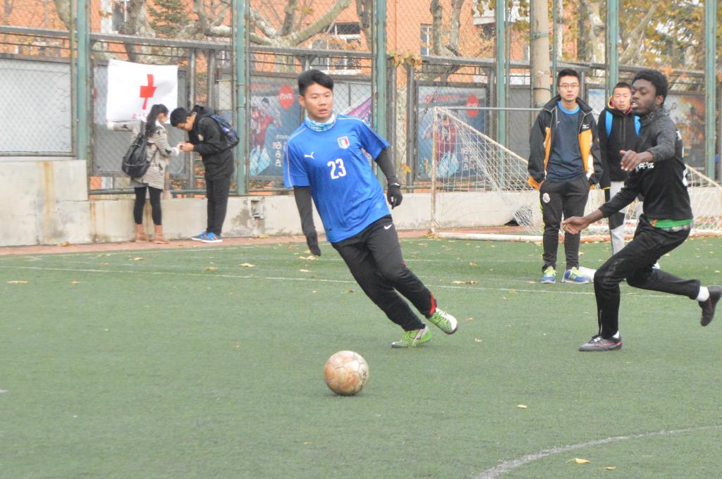 半决赛当天天气严寒,冷风肆虐,但物理足球队的队员们却热情高涨,面对一群实力强劲的国教选手也毫不示弱,赛前互相打气,士气昂扬。比赛伊始,国际教育学院的队员们表现强势,连进两球。物理队队员毫不气馁,奋起直追,66号韩杰假射骗过防守,将球传给5号杨佳烨,为物理夺得首分。随后韩杰罚点球又得一分,比分扳平,场面火药气息愈发浓厚。之后在激烈争夺下双方各进一球,上半场最终以3:3平结束。
