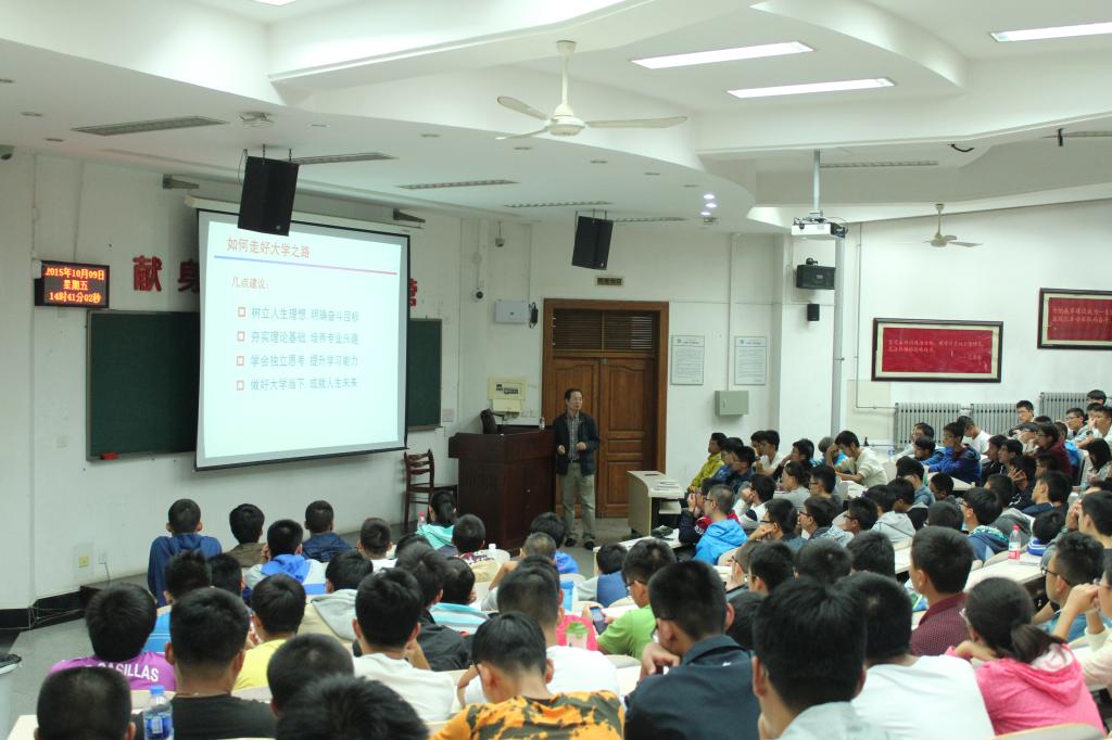 近三年,物理与光电工程学院的“院长第一课”系列讲座,作为学院级新生入学教育的品牌项目,一直深受学院新生们的期待。10月9日,学院院长赵明山教授为学院2015级全体新生带来了一堂精彩的“院长第一课”。学院党委副书记兼副院长杨木老师,2015级新生辅导员纪丹红出席活动。