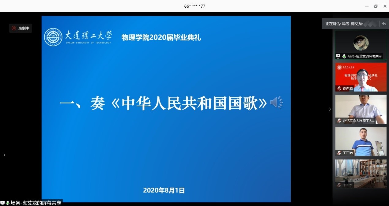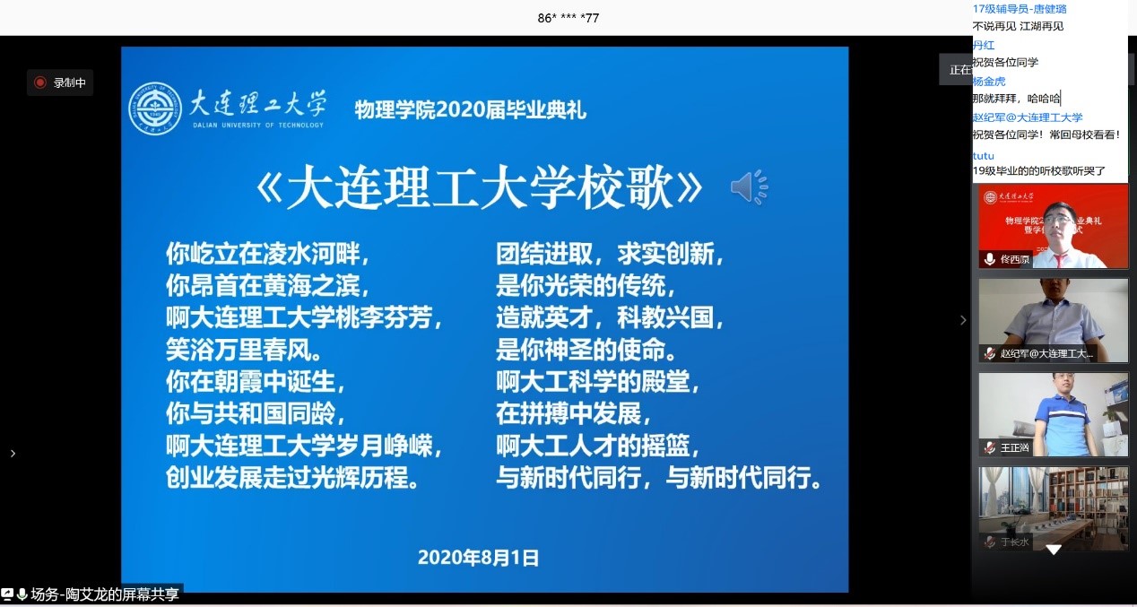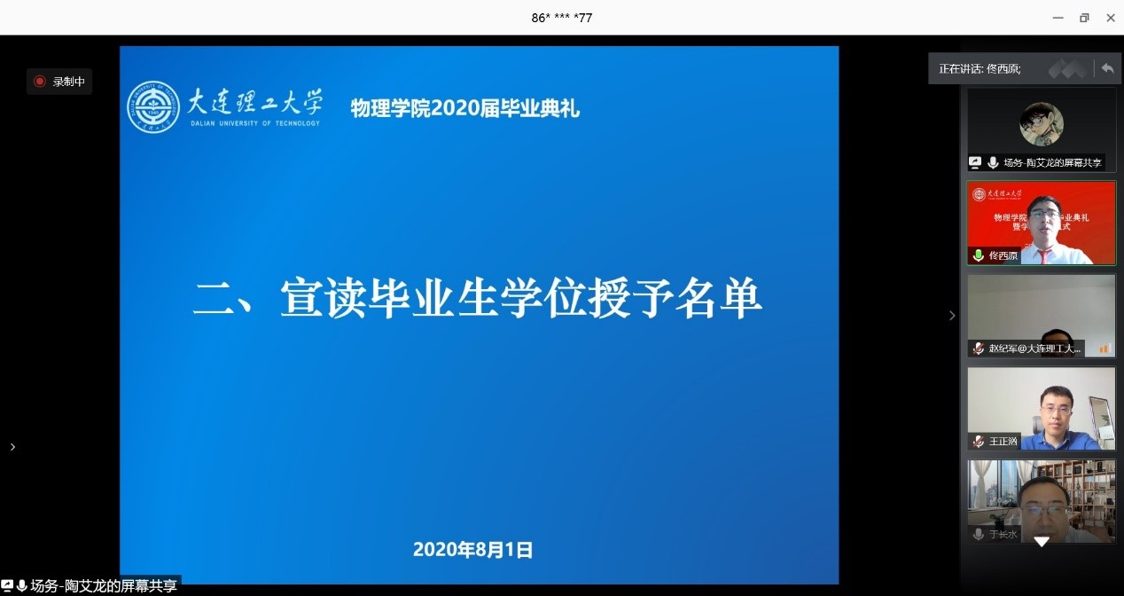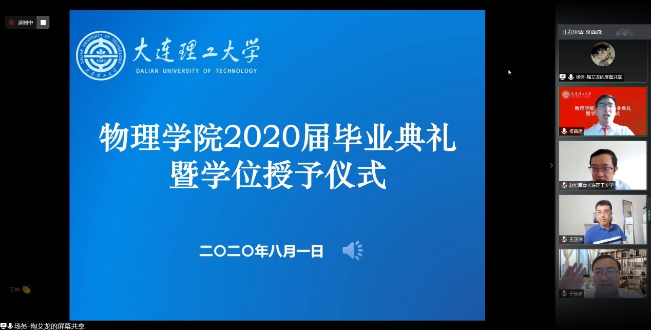 相送情无限,沾襟比散丝。又到一年毕业季,2020届物理学子即将告别亲切熟悉的校园,踏上崭新的人生旅途。2020年8月1日上午10时,新利·体育(中国)官方网站2020届毕业典礼暨学位授予仪式以网络直播的形式成功举行。出席的嘉宾有新利·体育(中国)官方网站院长、博士生导师赵纪军教授;党委书记、博士生导师王正汹教授;副院长、博士生导师陈茂笃教授;副院长、博士生导师于长水教授;副院长、博士生导师高飞教授;党委副书记兼副院长于艳敏老师;党委副书记兼副院长、纪委书记周福良老师;学生工作办公室主任、2018级、2019级本科生辅导员纪丹红老师;研究生辅导员张弛老师;2017级本科生辅导员唐健璐老师。此外,本次典礼也面向本科生班主任、全学院的其他老师和同学,毕业生家长们发出邀请。2020届本科毕业生辅导员佟西原老师担任主持人。