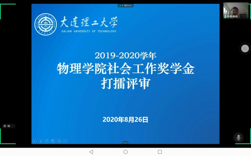 2020年8月26日上午9时,新利·体育(中国)官方网站社会工作奖学金线上答辩会顺利举办。出席本次会议担任评委的嘉宾有:物应1901班思政班主任、体育场馆中心主任张磊老师,新利·体育(中国)官方网站党委副书记、副院长、纪委书记周福良老师,物大珩1801班专业班主任、大学物理教学中心副教授于杰老师,物大珩1801班思政班主任、学校宣传部网络宣传科科长许剑老师,物应1801班专业班主任、纳米光电技术研究所副教授荆振国老师,物应1801班思政班主任、学校宣传部理论宣传科科长牟霖老师,物应1901班专业班主任、凝聚态物理研究所副研究员周思老师,学院学生工作办公室主任、18、19级辅导员纪丹红老师。17级辅导员唐健璐老师担任本次线上答辩会主持人。