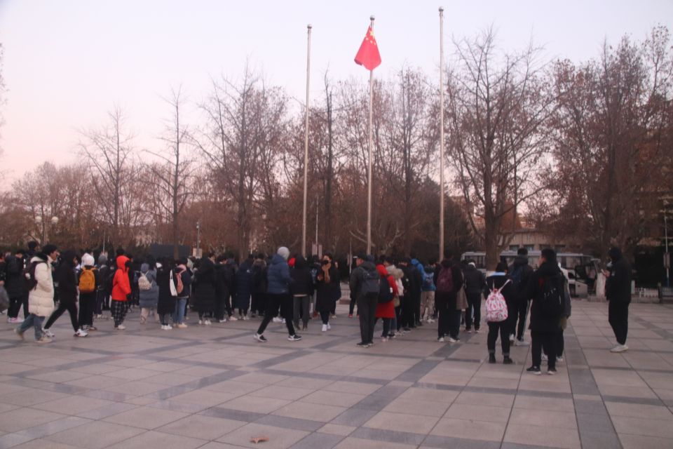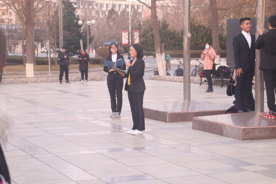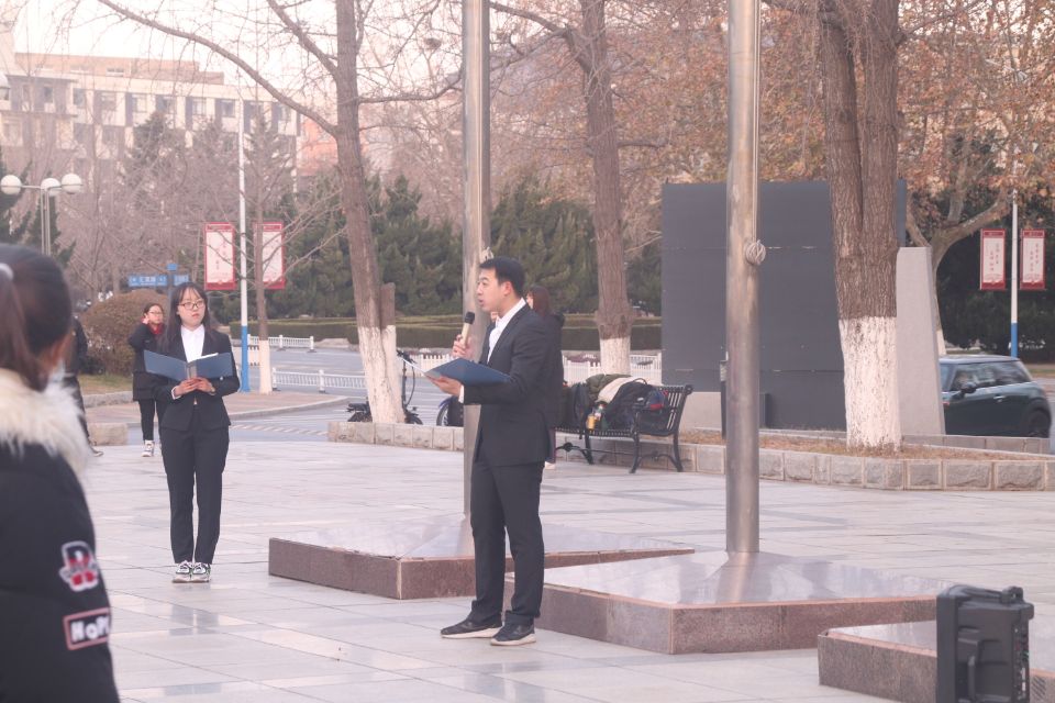尽管已是小雪节气之后,气温转寒,但全体在场学生及工作人员不畏寒冷,迎着朝阳开展本次升旗仪式。主持人李锦璇向大家讲述新中国创建以来的种种经历,随着经济建设地不断进行,如今祖国已经收获累累硕果。身为大工学子,更应响应国家号召,以青春告白祖国,续写盛世华章。李锦璇同学的声音如春雷般滚动在广场上,升旗仪式正式开始。