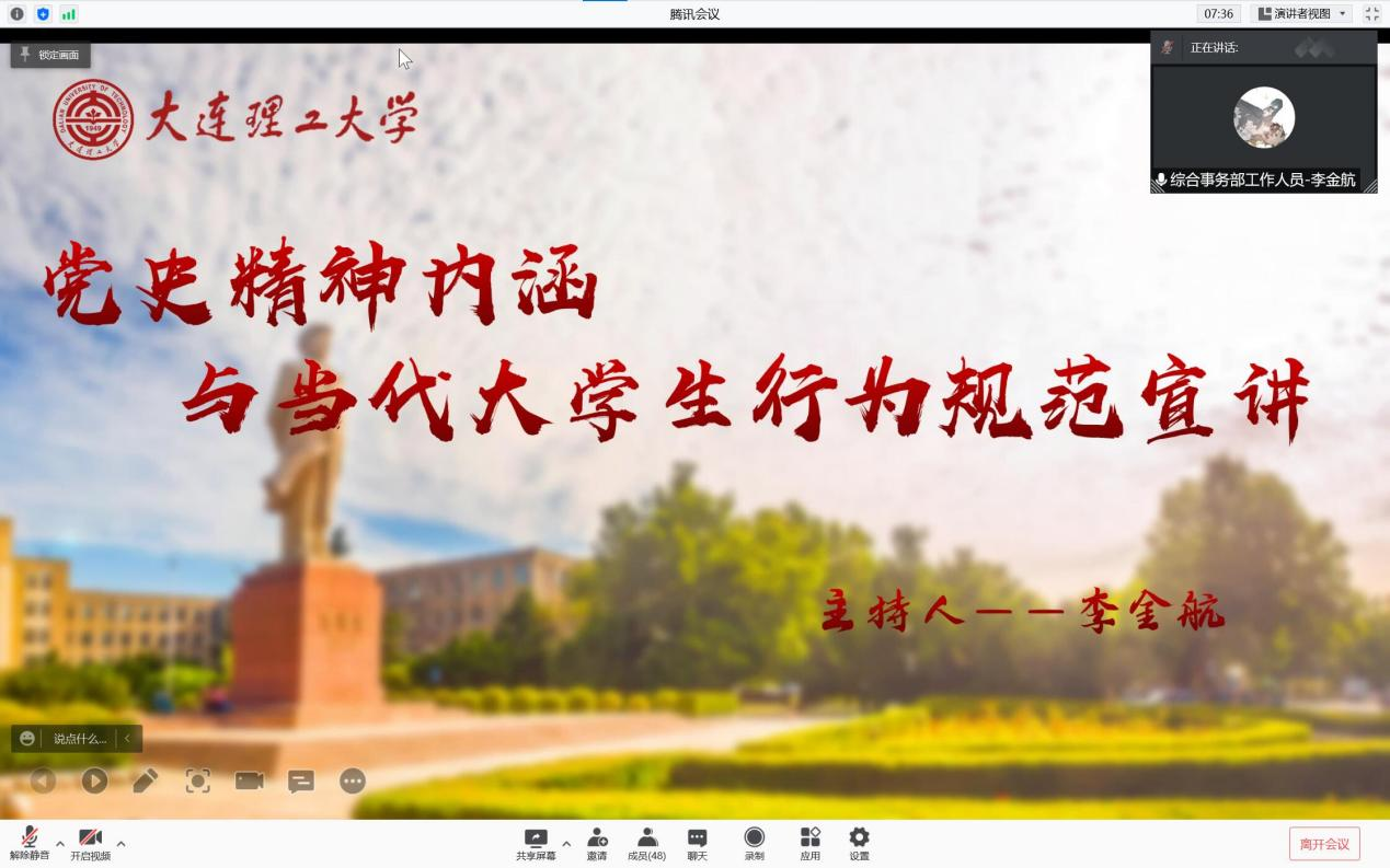 2021年11月12日18:30,新利·体育(中国)官方网站党史精神内涵与当代大学生行为规范宣讲在线上顺利召开。